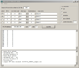 This utility reads the PLC memory (Ethernet interface only) and converts the selected datablocks into CSV (character separated values) pure text files. The output CSV file is then ready for data import and display on any suitable program, including MS Excel.